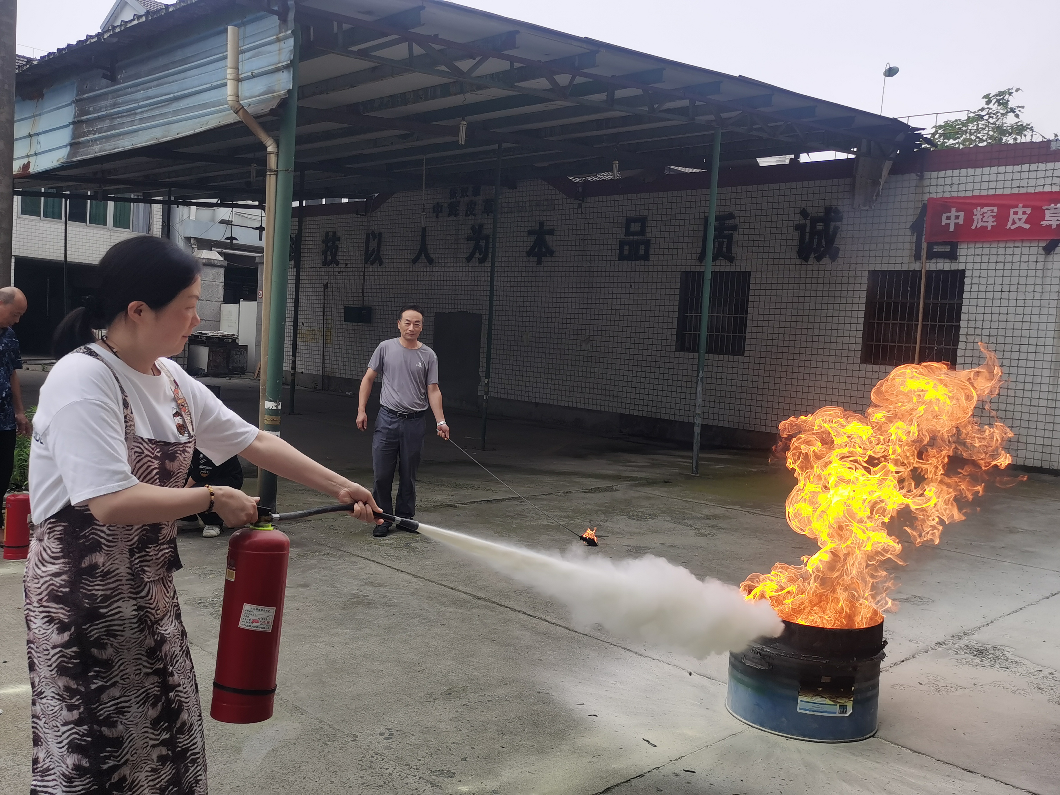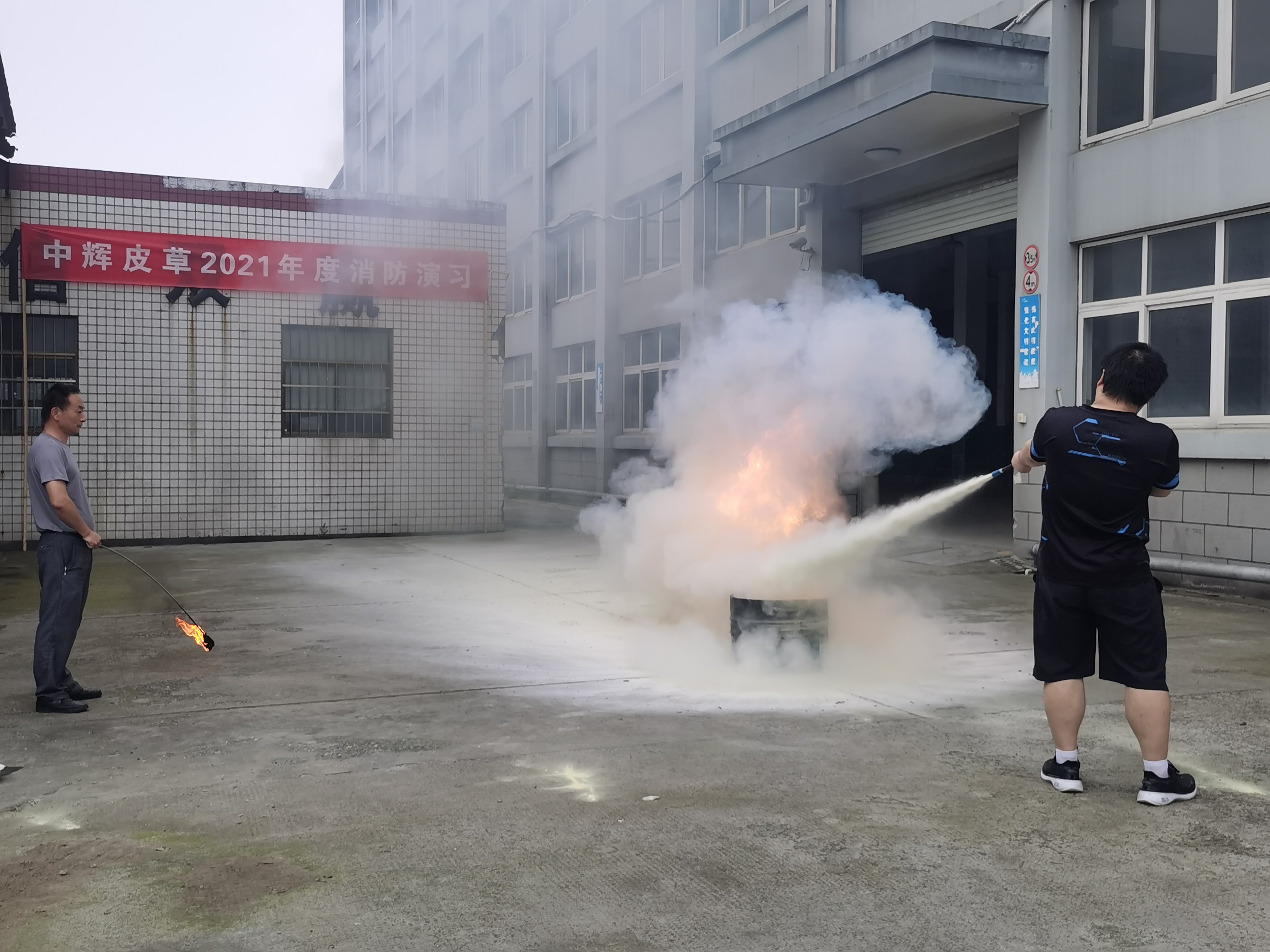 在学习了灭火器的“一看二摇三拔四喷”的使用方法后,依次上前实操使用灭火器进行灭火演练。