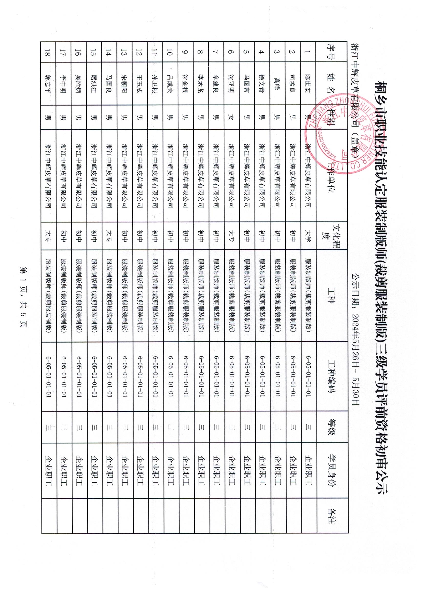 浙江午夜黄色网站皮草有限公司桐乡市职业技能认定服装制版师(裁剪服装制版)三级学员评前资格初审公示