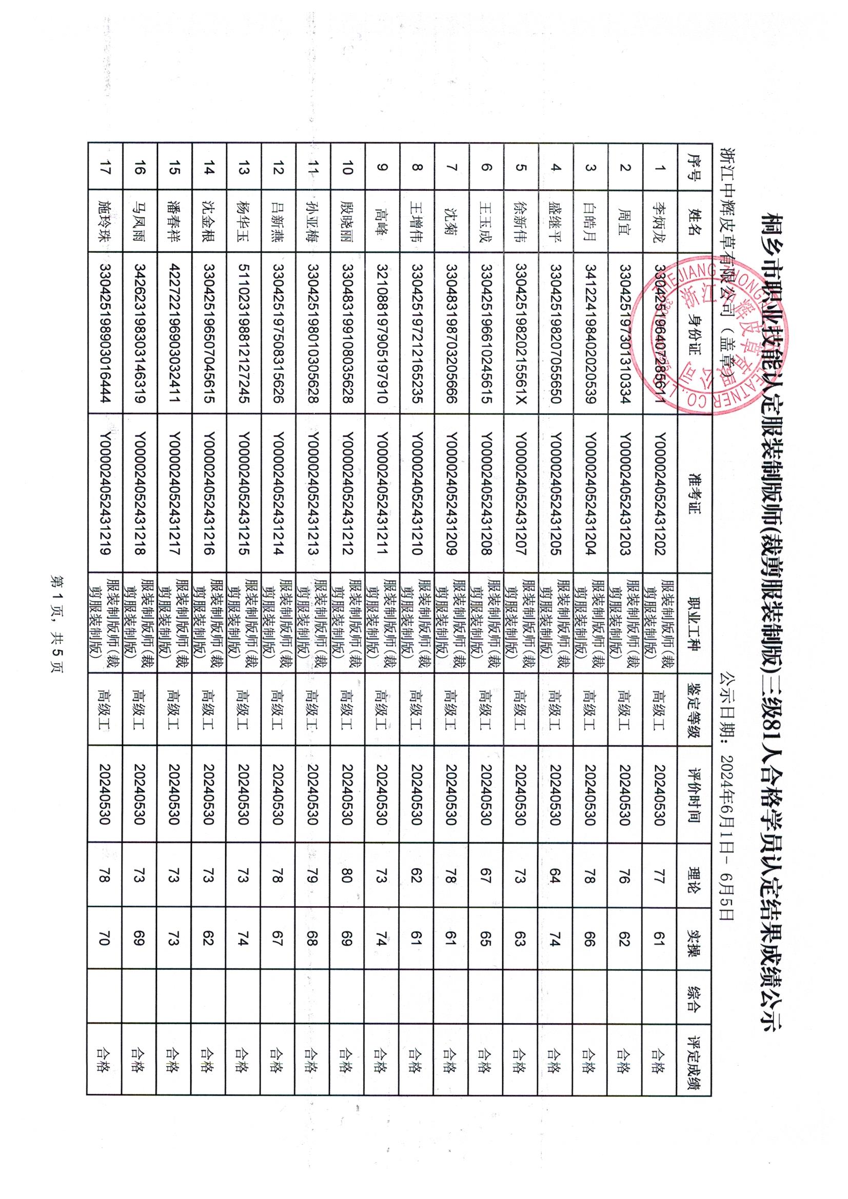 浙江午夜黄色网站皮草有限公司桐乡市职业技能认定服装制版师(裁剪服装制版)三级81人合格学员认定结果成绩公示